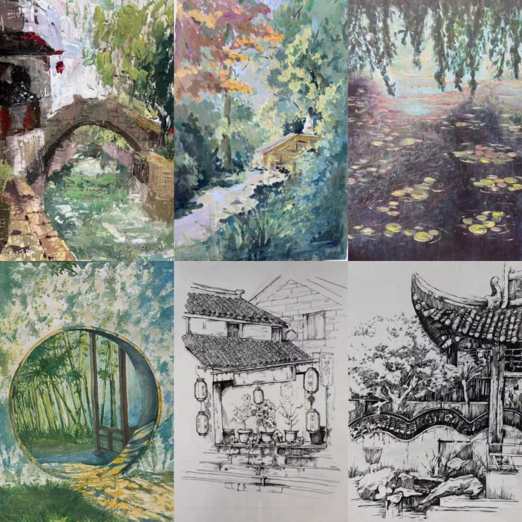 在十天的课程中,同学们风雨无阻,在老师的带领下走进甪直,用画笔记录下这里的美景和风情。作品分为传统建筑风景类、现代设计创意类和师生合作的创新实践类作品。同学们通过在甪直水乡的写生课程,更深刻地体验了乡村自然风光、人文景观以及当地的文化特色,锻炼了学生们的绘画技巧,更提升了对生活的观察力,激发了创作灵感。
