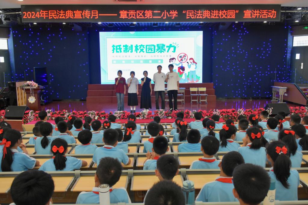 在章贡区第二小学的普法小课堂上,“我们能不能用爷爷奶奶给的压岁钱去打赏主播啊?”“高空抛物的行为对不对呀?”为了让处于小学阶段的孩子们更深入地了解《民法典》,民法典宣讲团成员以提问方式展开,围绕主播打赏、个人隐私、高空抛物等多个热点话题,向孩子们生动地讲解了“生活中的民法典”。为了帮助孩子们更好地接受法律知识,宣讲团成员还精心制作了动画课件,以讲故事的方式叙述了“小明的一生”,引用日常生活中的真实案例进行了生动形象的释法说明,打造“沉浸式”法治体验,为给孩子们呈现图文并茂的“法律大餐”。同时,普法志愿者们还自编自导,为小学生们带来了一场校园反霸凌的情景剧,帮助孩子们更好地接受法律知识,现场氛围十分活跃。