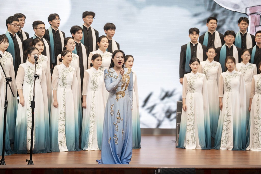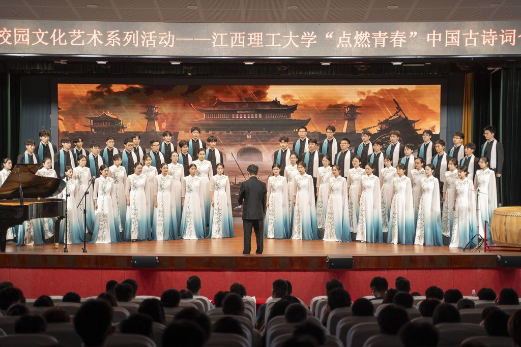 “点燃青春”中国古诗词合唱音乐会分为“壮美山河”“四季飞花”“家国情怀”“意暖情深”“点燃青春”等五个篇章,八角之声合唱团以混声合唱、男声合唱、女声合唱、领唱与合唱、小合唱等演唱方式,结合朗诵、器乐、情景等多种艺术呈现形式,生动演绎了《观沧海》《登高》《静夜思》《游子吟》《长歌行》等20首经典古诗词,通过诗与歌的“双向奔赴”,让书写在古籍里的文字唱起来、活起来、潮起来。精彩的演唱不仅让在场师生感受到了中华优秀传统文化的独特魅力,更用艺术的方式极大地推动了古诗词在新时代的赓续传承,有力促进了中华优秀传统文化的创造性转化和创新性发展,激励现场观众坚定文化自信,传承弘扬中华优秀传统文化。