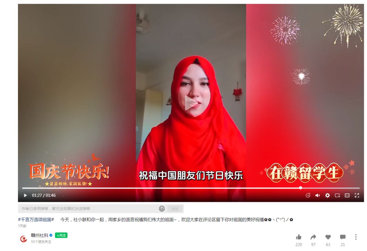 国际学生纷纷送上自己诚挚的祝福。巴基斯坦籍语合中心项目学生SHAHBAZ MUHAMMAD和ZOYA IRFAN录制专门视频,祝福中国朋友们国庆节日快乐。