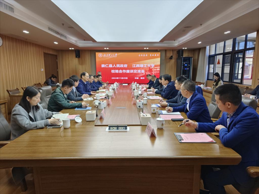 与崇仁县人民政府在三江校区濂溪楼1号会议室举行校地合作座谈交流会。校党委常委、副校长廖春发,崇仁县委副书记、县长黄志刚出席会议,崇仁高新区党工委、崇仁县人社局、崇仁县委人才发展服务中心、江西亚珀电器有限公司及百家乐