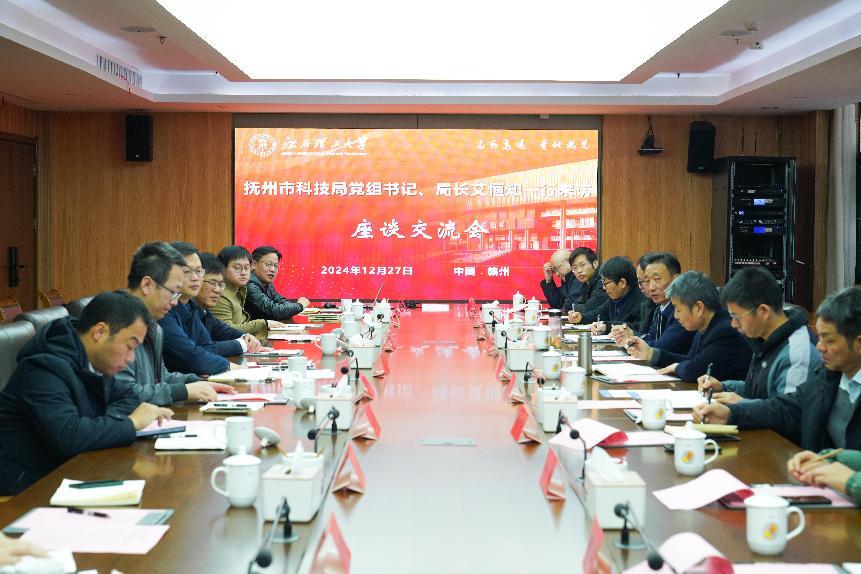 本网讯 12月27日下午,抚州市科技局党组书记、局长艾恒知带领抚州市相关企业家来校对接电化学、有色金属精深加工领域合作事项,并召开座谈会。校党委常委、副校长熊志华,赣州市科技局党组书记、局长郭澜,副局长陈浩华出席座谈会,相关部门主要负责人参加会议。会议由校科学技术处副处长朱易春主持。