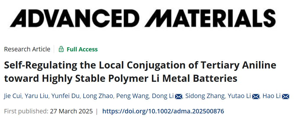 材料科学与工程学院(动力储能电池及材料江西省重点实验室)李栋副教授在固态电池领域取得重要进展,成果在国际顶级学术刊物Advanced Materials (影响因子:27.4)以 “Self-Regulating the Local Conjugation of Tertiary Aniline toward Highly Stable Polymer Li Metal Batteries”为题发表论文。百家乐
