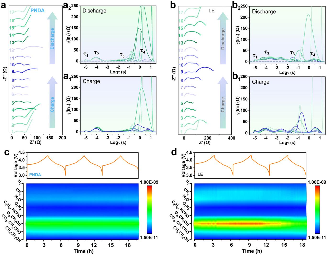 图1 在不同SOC(荷电状态)下,a) Li||PNDA||NMC和 b) Li||LE||NMC电池的操作EIS图及DRT变换;c) Li||PNDA||NMC和 d) Li||LE||NMC电池的充放电曲线及相应的质量m/z 2(H2)、16(CH4)、18(H2O)、26(C2H2)、30(C2H6,HCHO)、32(O2)、44(CH3CHO,CO2)和46(CH3CH2OH)。