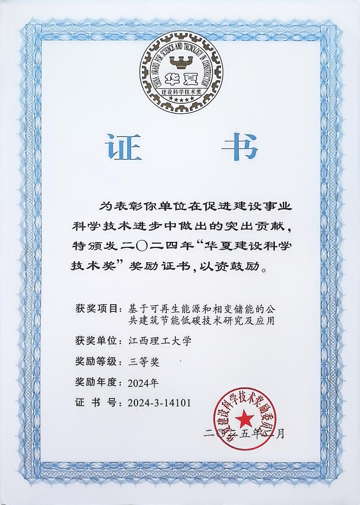 作为第一完成单位参与的“基于可再生能源和相变储能的公共建筑节能低碳技术研究及应用”项目获得三等奖。