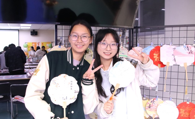 漆扇制作现场还设置了题字互动环节,为同学们漆扇作品添上点睛之笔。“事事如意”“平安顺遂” 等寓意吉祥的词语,被一笔一划地誊写在扇面上。笔墨的遒劲与大漆自然形成的纹路相互映衬,刚柔并济,既让传统漆扇多了一抹个性化的色彩,又将文字承载的美好期许与非遗工艺的古韵深度融合。参与活动的谭欣荣同学感慨道:“此次活动非常有意思,不仅激发了我对传统工艺的浓厚兴趣,还让书本上的非遗文化‘活’起来。希望学院以后能多开展这样的实践活动!”